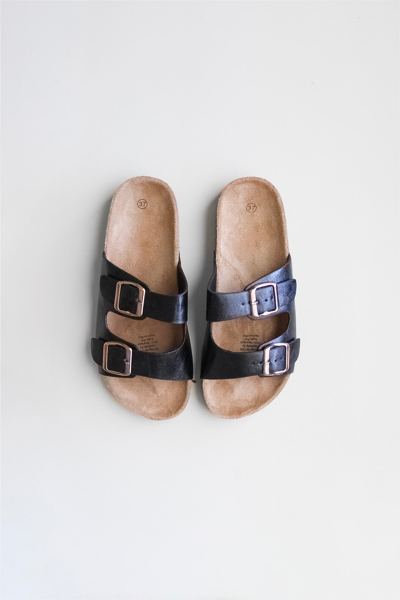 Su diseño con doble correa ajustable y hebillas metálicas combina comodidad, minimalismo y elegancia.