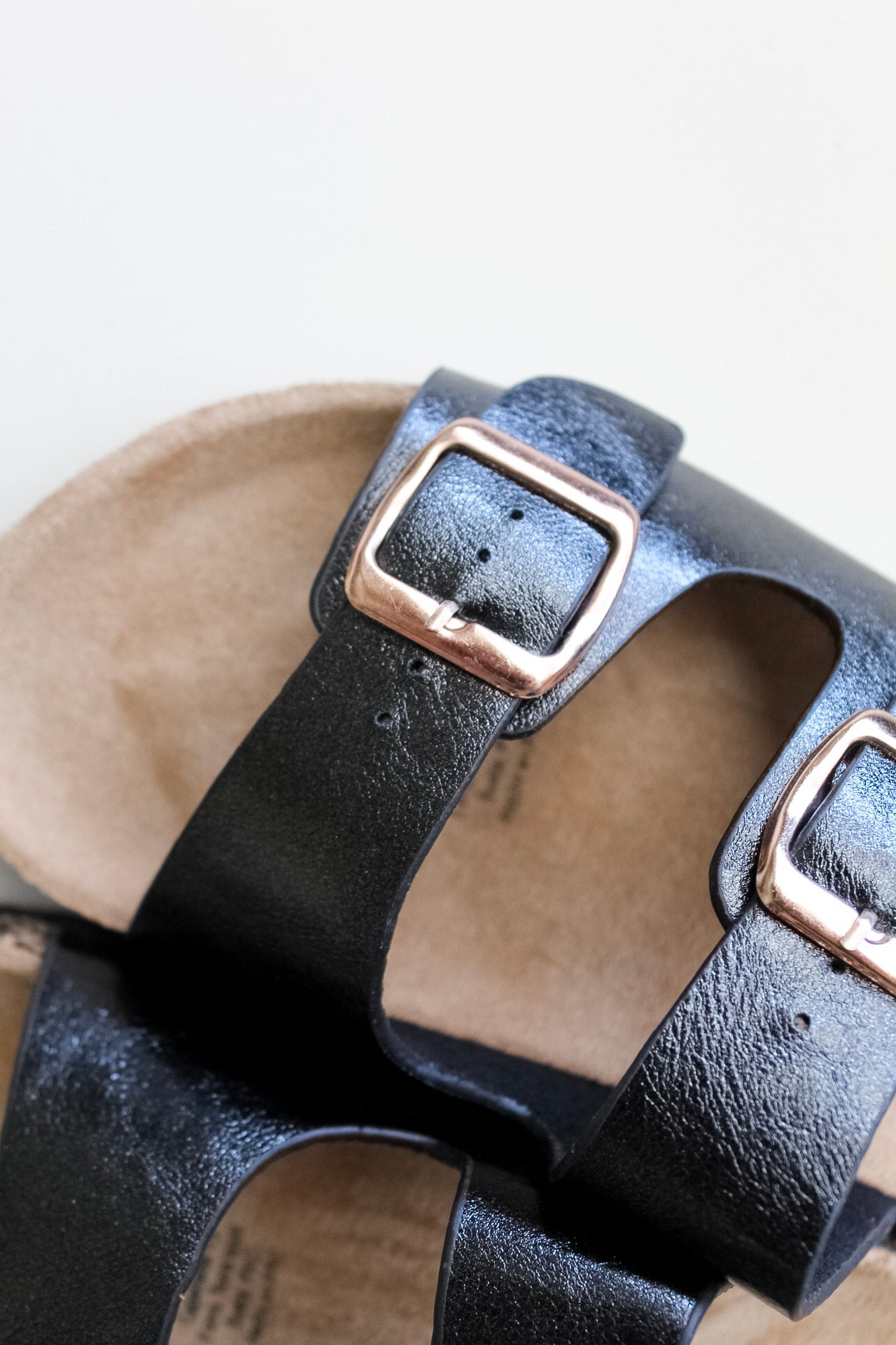 Las Creta Black Bright reinterpretan la sandalia ecológica con un acabado brillante que aporta un toque sofisticado a tu look diario.